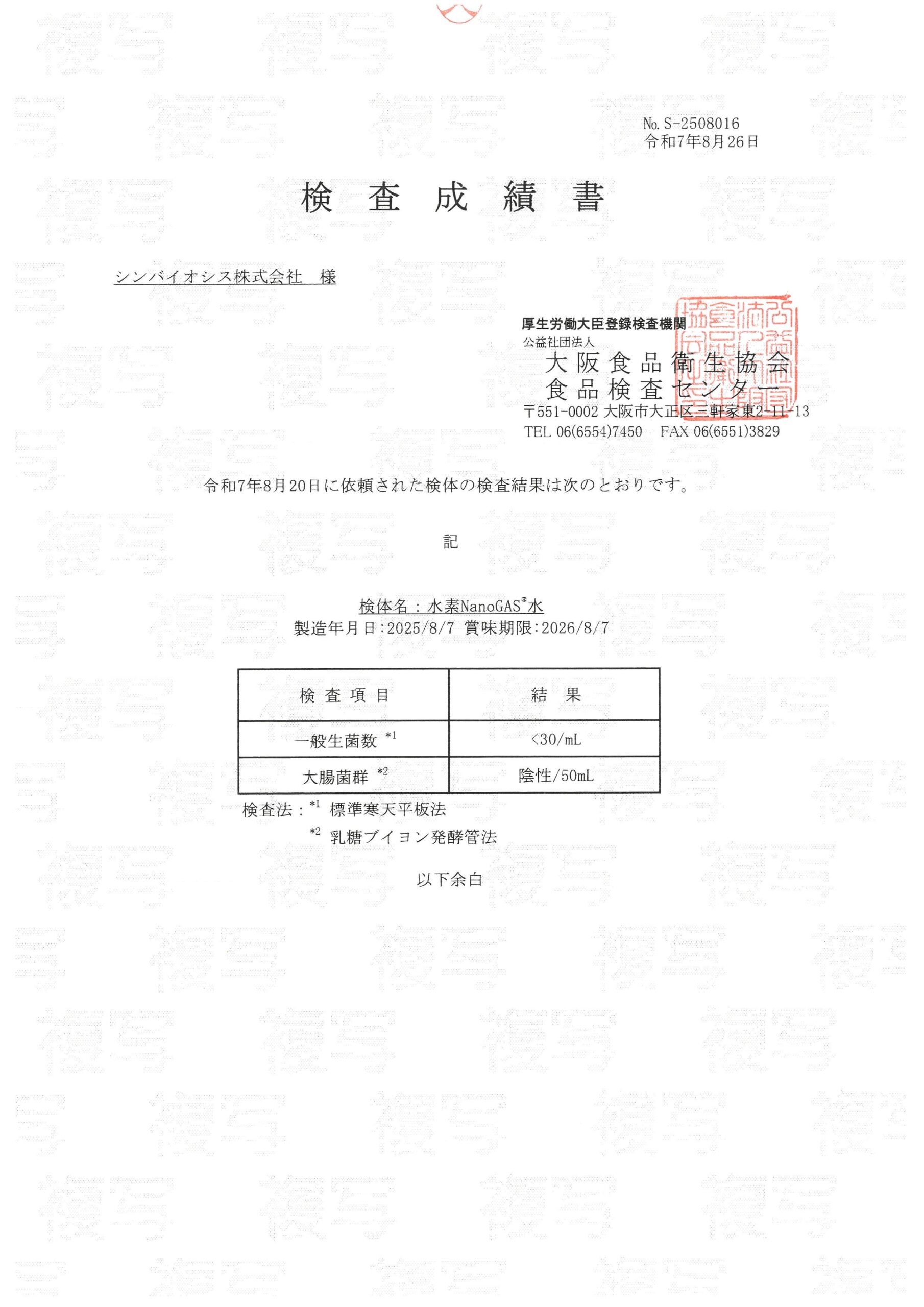 <検査成績>NanoGAS®水