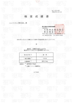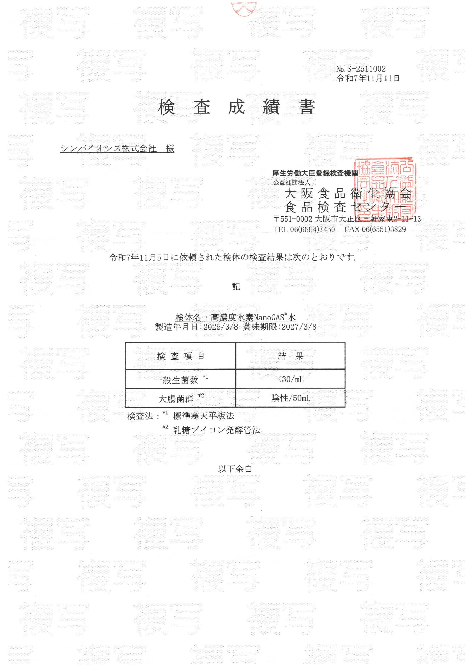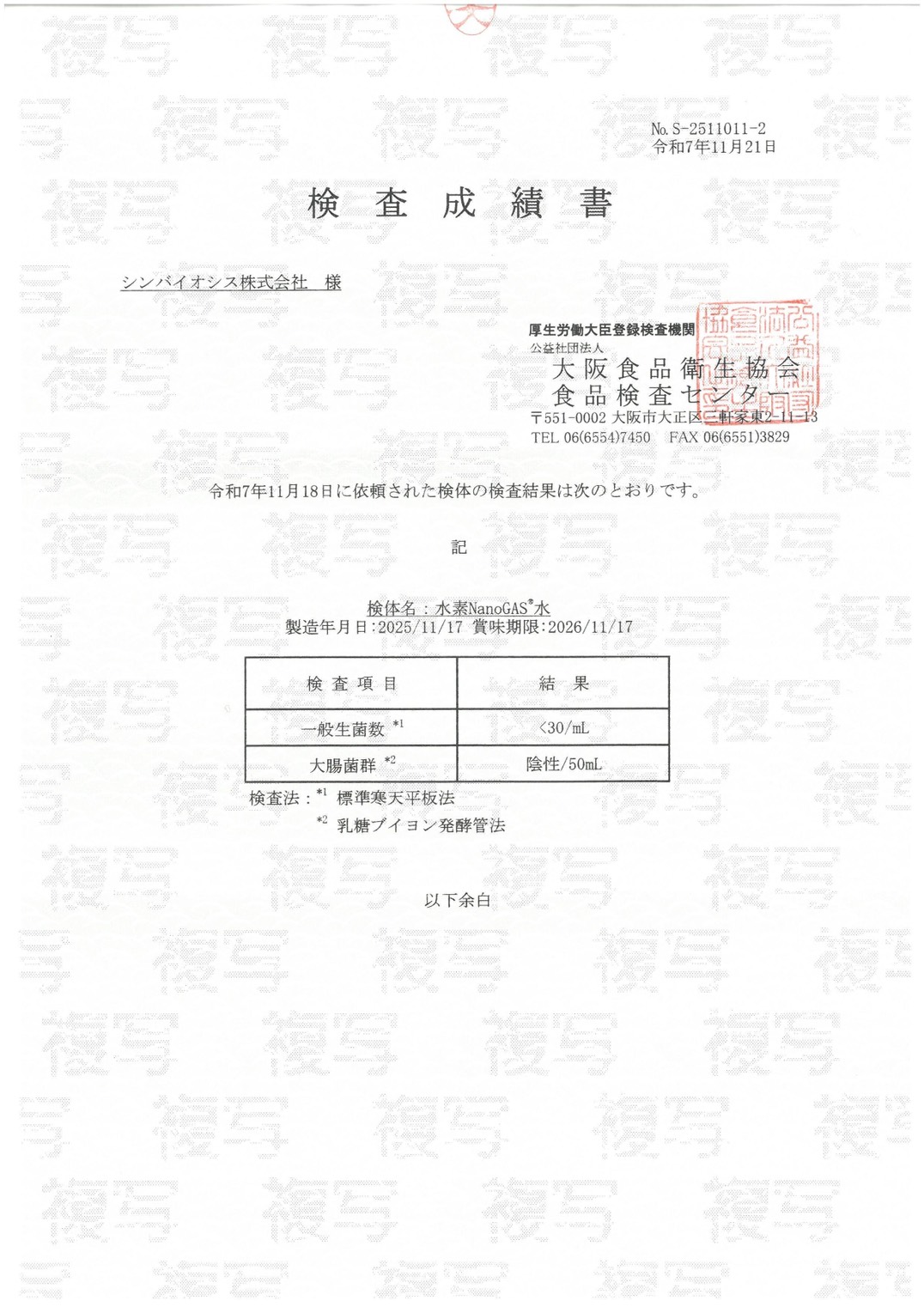 当社のNanoGAS®水は、定期的に水質検査を行っています。 検査成績は下記の通りです。